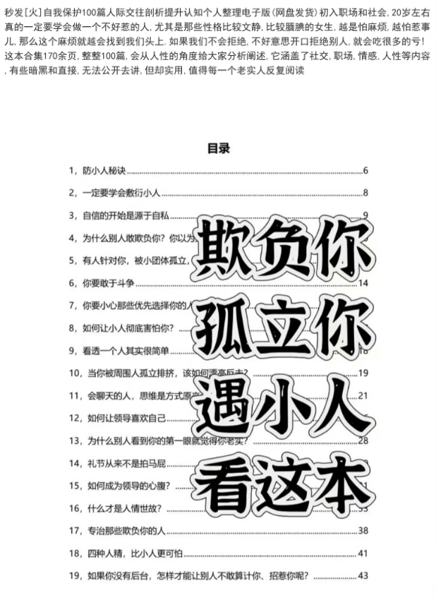 ![]() | 秒发[火]自我保护130篇人际交往剖析提升认知个人整理电子版 | ¥0.01 | 0件 | 充足 | 购买 |